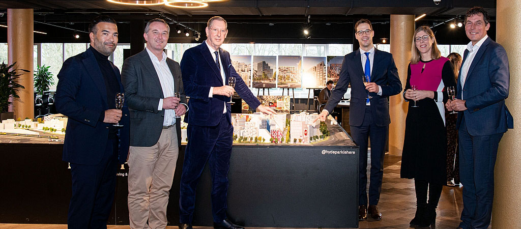 Vlak bij Station Hoofddorp wordt een groot nieuw wooncomplex met 563 woningen voor studenten gerealiseerd: de bouwwerkzaamheden zijn inmiddels in volle gang en woensdag 21 juni heeft in Hyde Park het feestelijke officiële moment plaatsgevonden om te vieren dat de realisatie is gestart. Jurgen Nobel, wethouder woningbouw van de gemeente Haarlemmermeer, Anneleen Lagae, voorzitter Raad van Bestuur bij DUWO, namens de directie Hyde Park André Snippe, Lars van Engelen, Peter van Oeveren, Marco Teuns en Edwin de Kuiper, directievoorzitter Dura Vermeer Bouw Midden West verrichtten samen de starthandeling.